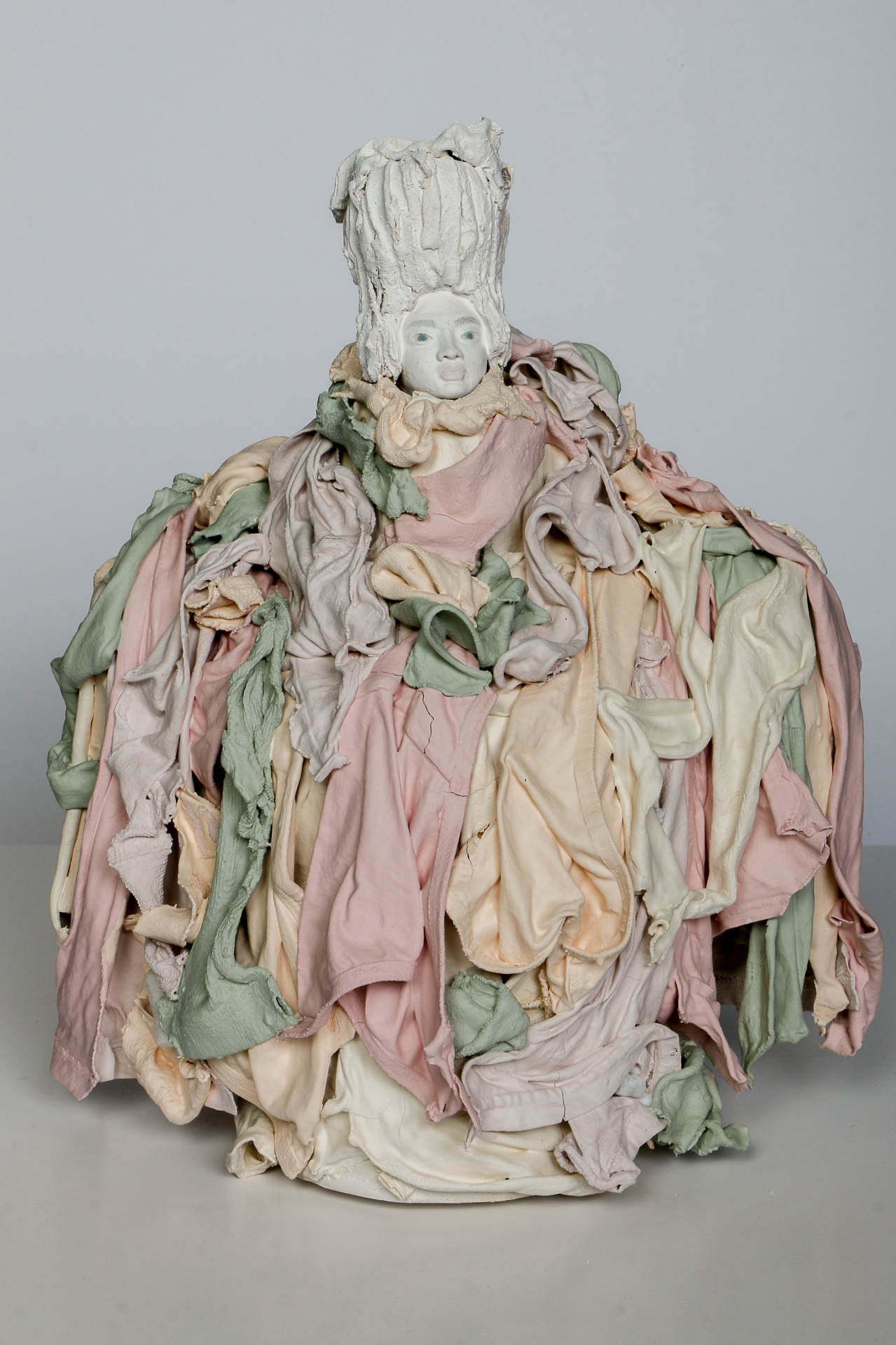"Horde Couture" Hand-built clay with slip drenched fabric low fired. 12x12